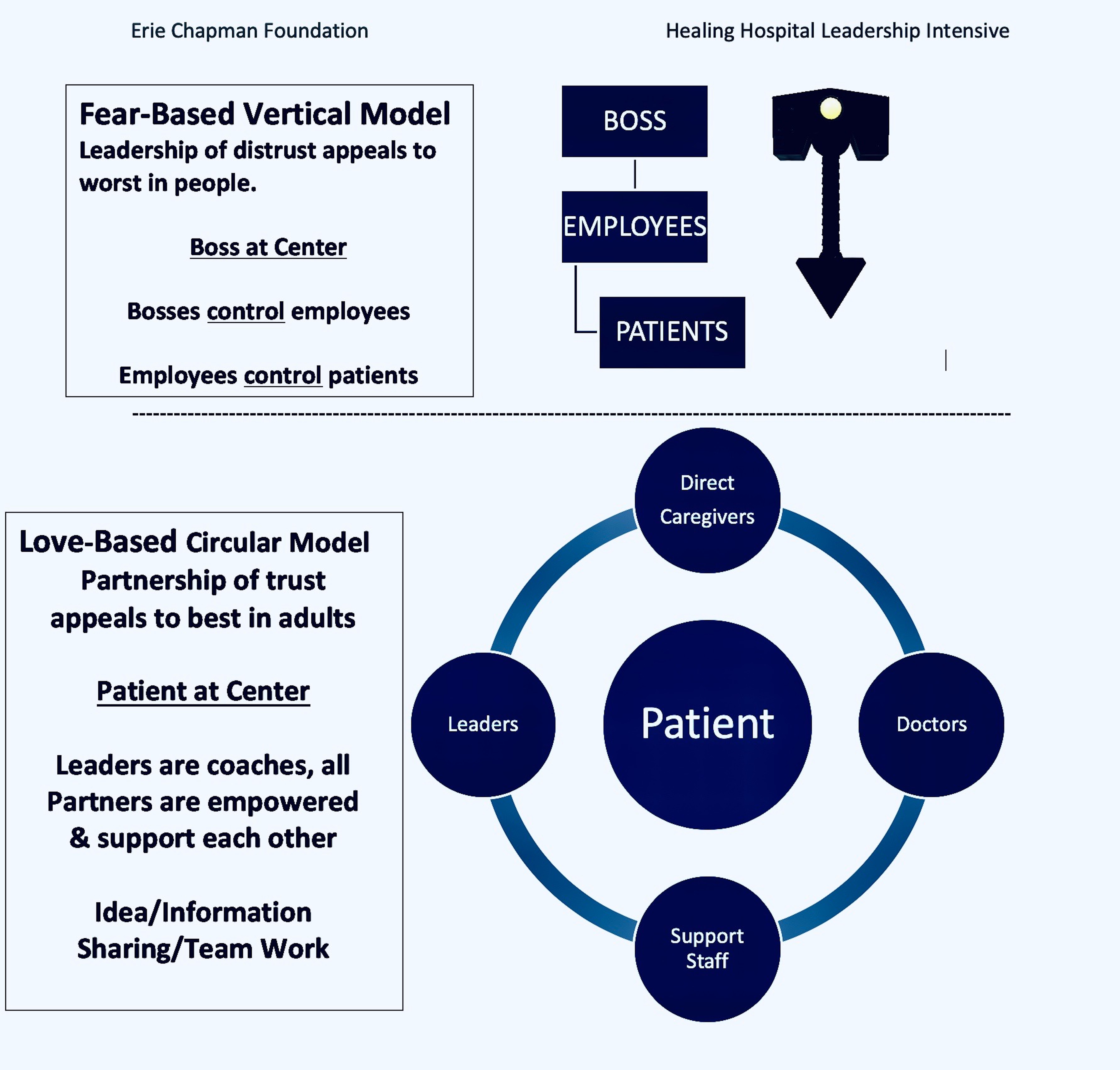 How does that inspire better performance? We are all children of God. Love requires replacing vertical, fear-based, boss-employee models with circular, love-based partnerships.
