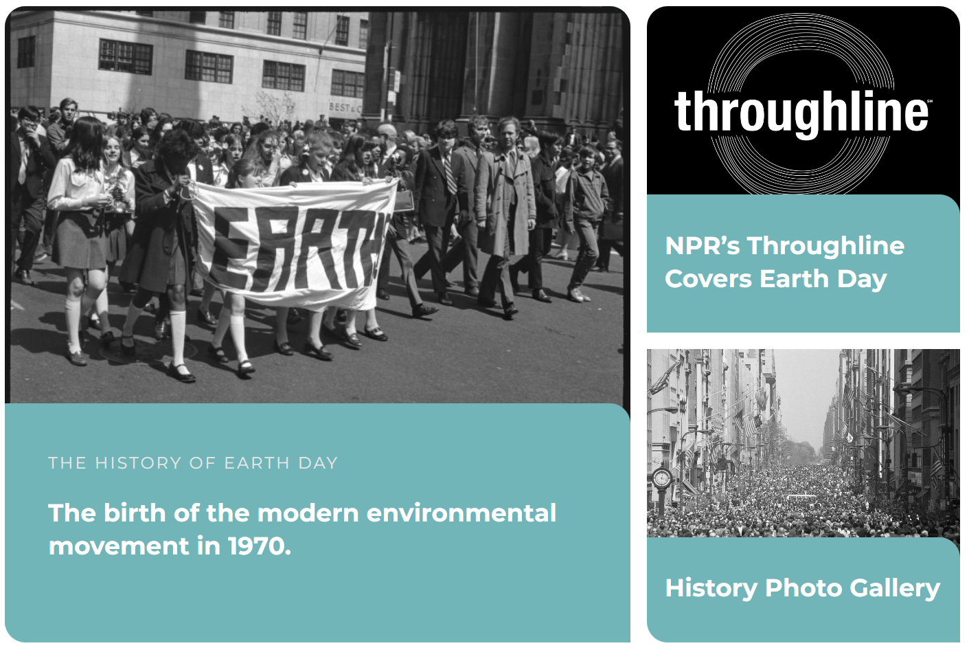 Groups that had been fighting individually against oil spills, polluting factories and power plants, raw sewage, toxic dumps, pesticides, freeways, the loss of wilderness and the extinction of wildlife, all united-on Earth Day around these shared common values. Earth Day 1970 achieved a rare political alignment, enlisting support from Republicans and Democrats, rich and poor, urban dwellers and farmers, business and labor leaders. By the end of 1970, the first Earth Day led to the creation of the United States Environmental Protection Agency and the passage of other first of their kind environmental laws. (Earthday.org)