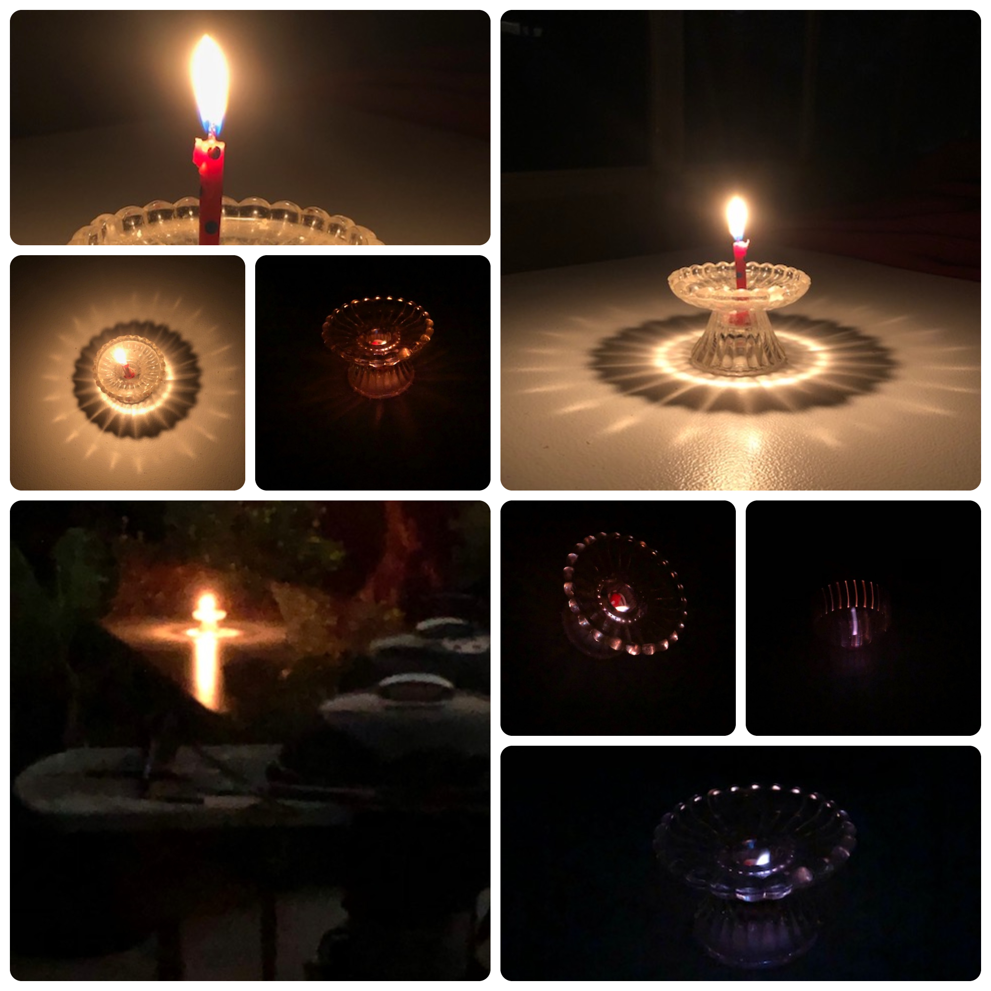 The magic began as I lit the candle, we were both stunned to see a beautiful mandala manifest from light shining through the glass and casting this design before our eyes. We sat spell bound watching the flame flicker and I began taking pictures from various vantage points. Starling suggested we turn out the lights and the radiance of light and shadows danced with colors swirling in changing hues. What caught our eye next was an incandescent light reflected in the glass door. This reminded me of a beacon of light streaming from a lighthouse offering safety in tumultuous times. Yet, all was calm in the surrounding quiet of this enchanted moment as time lay suspended.