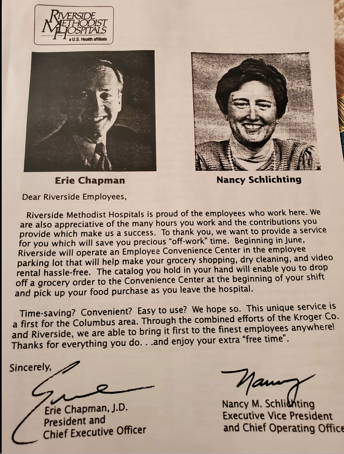 *Photo of announcement of EMPLOYEE CONVENIENCE CENTER at Riverside, launched when the great Mark Evans was SVP for HR. Circa 1989